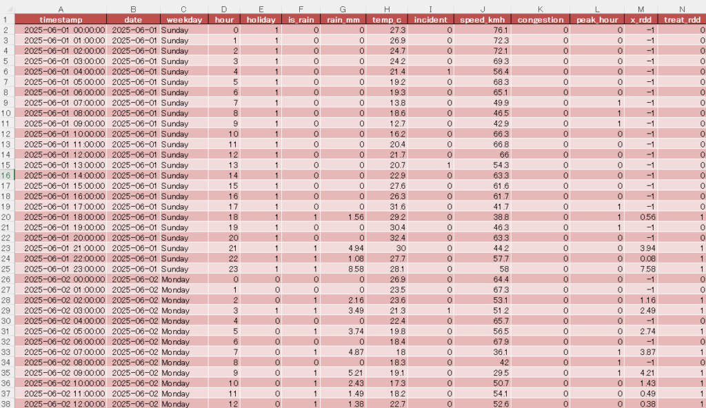 6月1日から10日の期間で、一時間ごとのデータを取得。データには「曜日」「雨かそうでないかを 0/1 で判定」」「雨量をmm単位で」「気温」「事故の有無」「車の速度」などを取得。