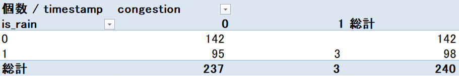 - x_clear = 0(晴れで渋滞=1 の件数:ピポットテーブルでは空欄)