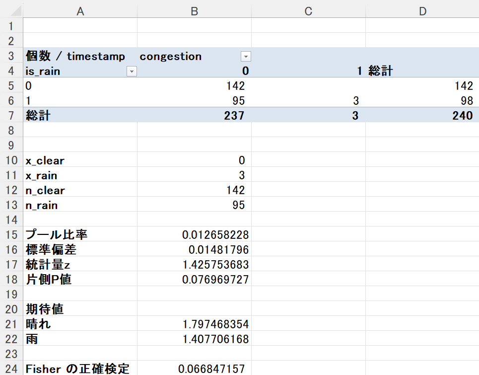 雨の渋滞率は晴れより約2.1ポイント高い傾向がみられた。z近似の片側P=0.077で、5%水準では有意差は確認できず、10%水準では有意。ただし期待度数が小さく近似の信頼性が低いため、Fisherの正確検定での再確認と追加データの収集が望まれる。