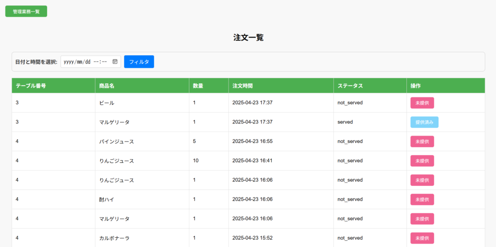 filter_date = NoneFlaskアプリケーションを再起動して、「注文一覧」をクリックします。