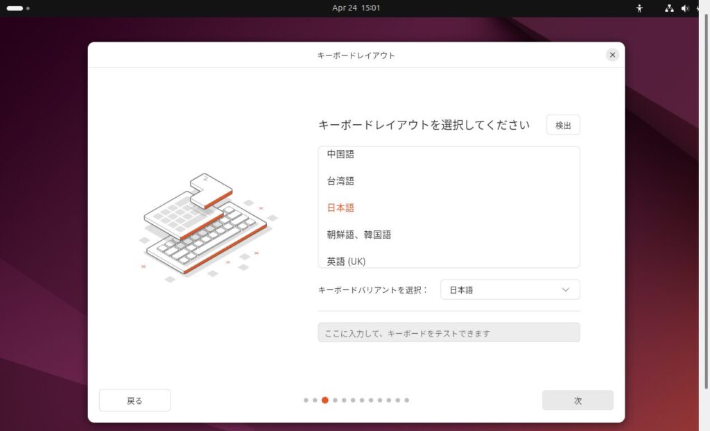 キーボードレイアウトの設定画面が表示されます。「日本語」を選択して「次」をクリックします。